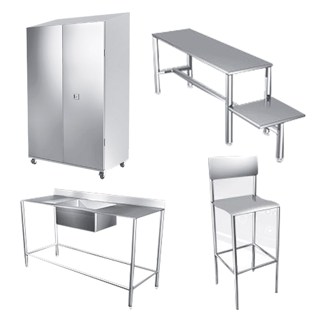 Mesas de trabajo, lavaplatos, campanas extractoras, estufas, planchas asadoras, freidoras, autoservicios, trampas de grasas, muebles de piso y pared, etc.